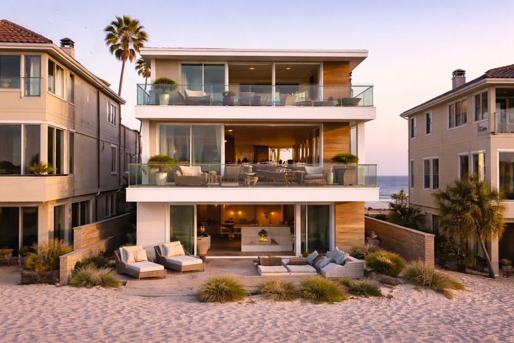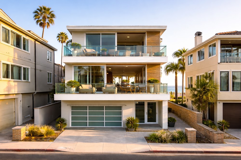 A clean, light-filled beach home with three levels of open living space and ocean-facing views. Large sliding doors connect the interior to wide balconies, bringing in natural light and sea air throughout the day. The layout is straightforward and flexible, with modern finishes, comfortable outdoor areas, and clear sightlines that work well for small gatherings, photo shoots, or relaxed coastal stays. Located just steps from the sand, it offers an easy, authentic Manhattan Beach setting without feeling overdesigned or staged.